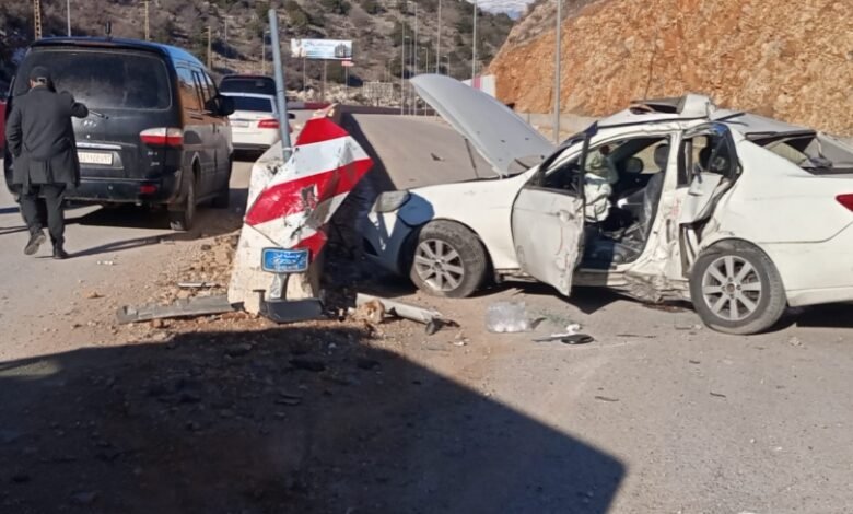 اصطدمت سيارة بالحاجز النصفي على طريق الدولية ما بين المصنع وجديدة يابوس يقودها السائق اسامة فارس وهو سوري جنسية وقد أُصيب بالحادث أية محمد وهي عراقية الجنسية وتم نقلهما عبر الدفاع المدني الى مركز سلوم الطبي في تعنايل