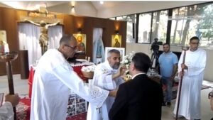 بعد الذبيحة تم غسل ارجل شاب تعافى من الادمان على المخدرات بعد علاجه في قرية الانسان والباسه اللباس الابيض بعد ان اعتذر من والديه وشكر يسوع على نعمة الشفاء .