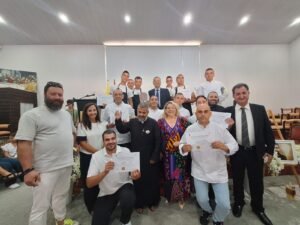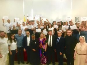 بعدها انتقل الجميع الى مسرح البابا فرنسيس في القرية حبث تم الاحتفال بتخريج دفعة كبيرة من الشابات والشباب تحت اسم ” صنارة مش سمكة ” وهو شعار الراحل ماتيو بمبادرة من جمعية سعادة السماء ونيلهم الشهادات المهنية في اختصاصات عديدة بالتعاون مع جمعية الشبان المسيحيين ومعهد الاكاديمية اللبنانية للتجميل Lebanese Academy of Beauty .