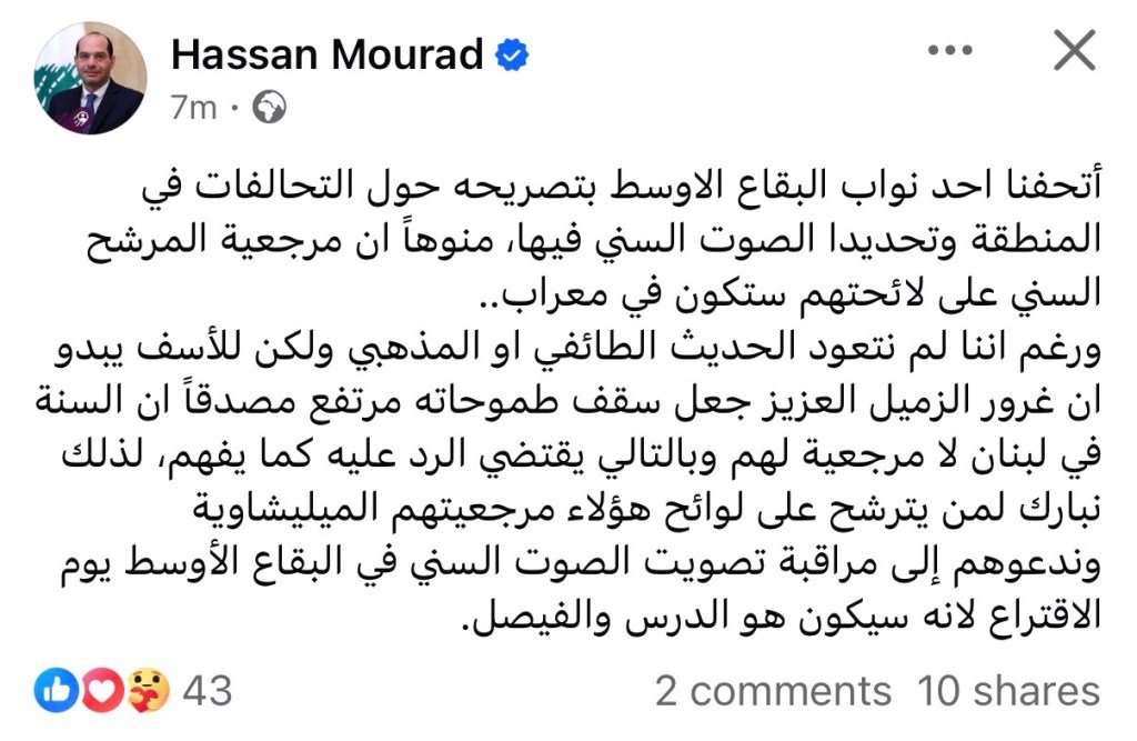 بيان صادر عن أيوب قزعون ردًا على النائب حسن مراد: